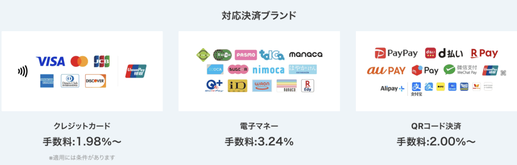決済手数料は決済方法によって異なり、クレジットカードは3.24%〜、電子マネーやQRコード決済は3.24%程度が目安となります。