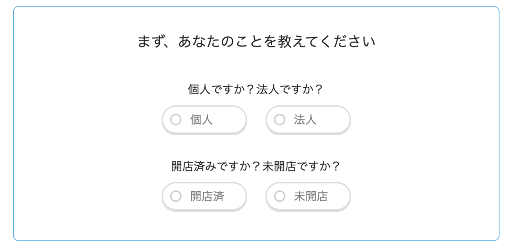 エアペイの公式サイトにアクセスして「お申し込み」ボタンをクリックしましょう。最初に事業形態(個人事業主または法人)を選択する画面が表示されます。