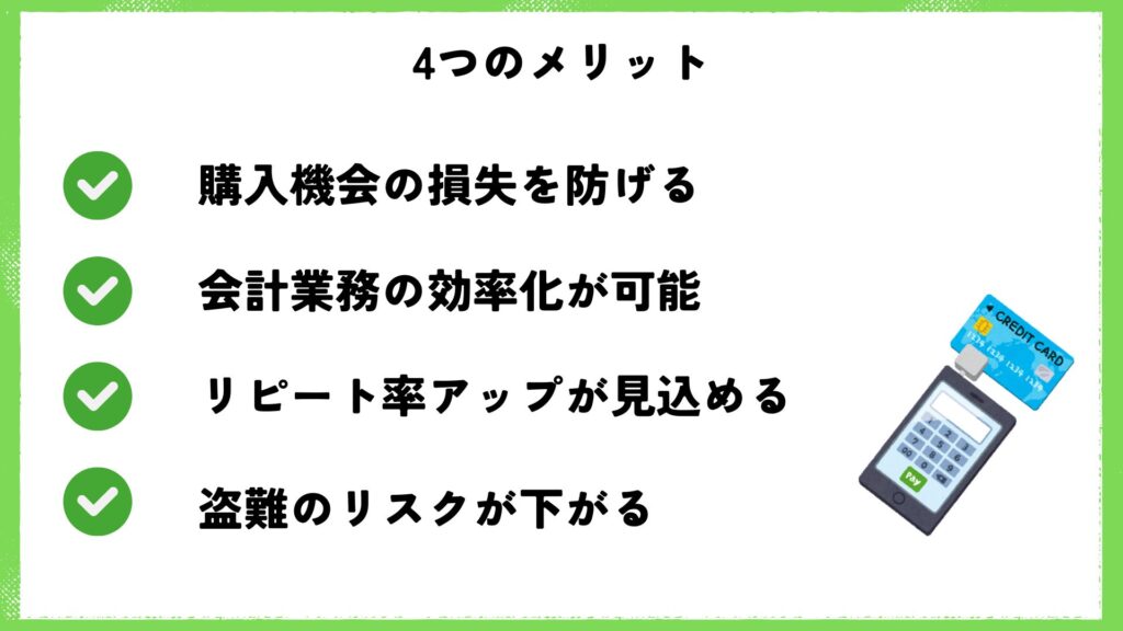 現金を店舗に置く必要が減るため、盗難リスクが下がります。また現金の数え間違いや紛失といったトラブルも防げるため、安心して営業に集中できるでしょう。