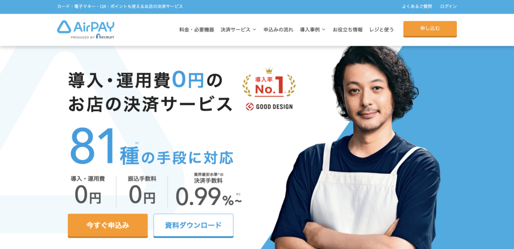 AirペイはリクルートグループのAirレジと連携できるキャッシュレス決済サービスで、80種類以上の決済手段に対応している点が大きな強みです。